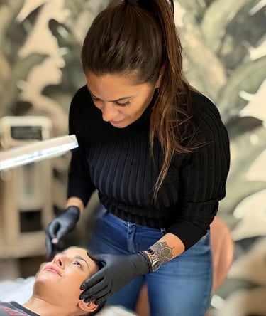 Adormecimiento y Microblading: Para garantizar su comodidad, se aplica una crema anestésica tópica en el área de las cejas. Una vez que esté relajado, nuestro artista comenzará el proceso de microblading, implantando cuidadosamente pigmento en la capa de epidermis de su piel.